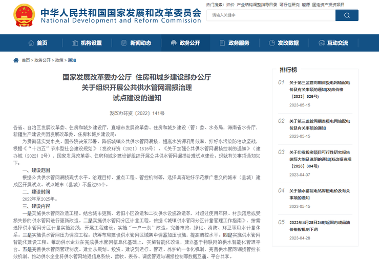 2022年2月25日,国家发改委办公厅、住建部办公厅发布关于组织开展公共供水管网漏损治理试点建设通知,明确提出要实施供水管网分区计量工程、供水管网智能化建设工程。要求公共供水管网漏损率高于12%(2020年)的试点城市(县城)建成区,2025年漏损率不高于8%;其他试点城市(县城)建成区,2025年漏损率不高于7%。