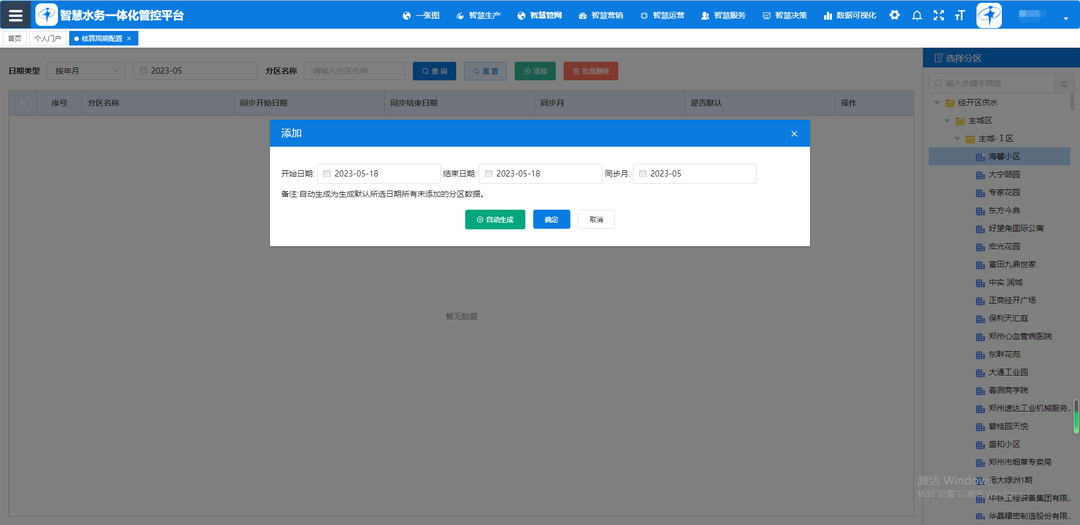针对分区配置核算周期,调整供、售水量时间统计口径一致,配置完成自动应用至该分区的供水量与用水量计算,统一口径,解决因抄表周期带来的供、售水量时间节点不一致的问题。